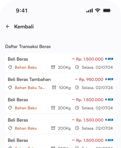 Setiap pembelian, penggunaan, dan penyesuaian stok tercatat secara detail.